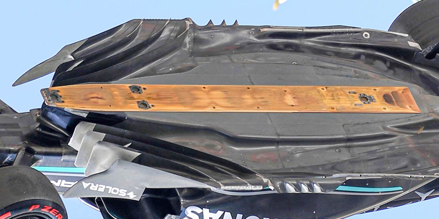 Misurando attorno a questi inserti di titanio, la FIA si assicura di controllare il punto del fondo che è stato più vicino al suolo e progettato per sopportare il massimo stress. Se lo spessore del plank è inferiore a 9 mm in uno qualsiasi di questi quattro punti, la squalifica è automatica.